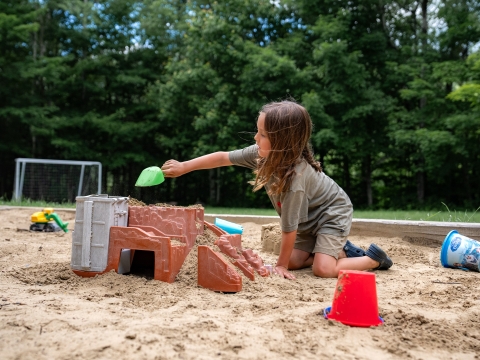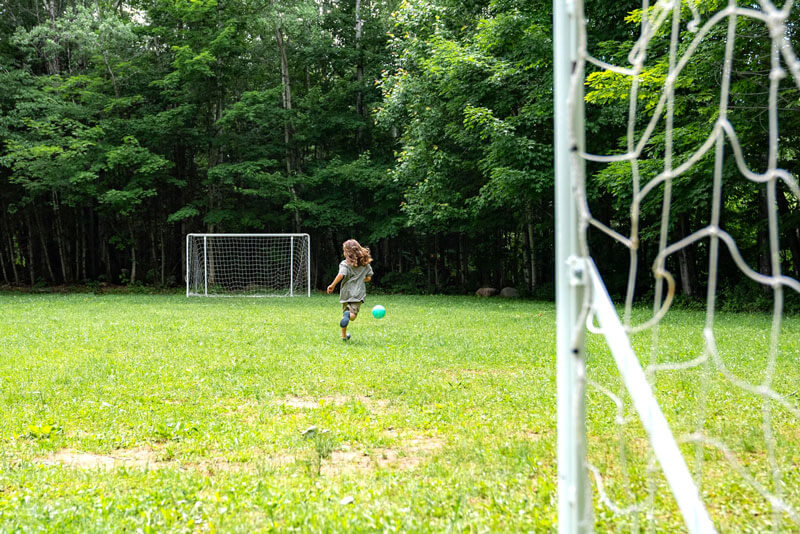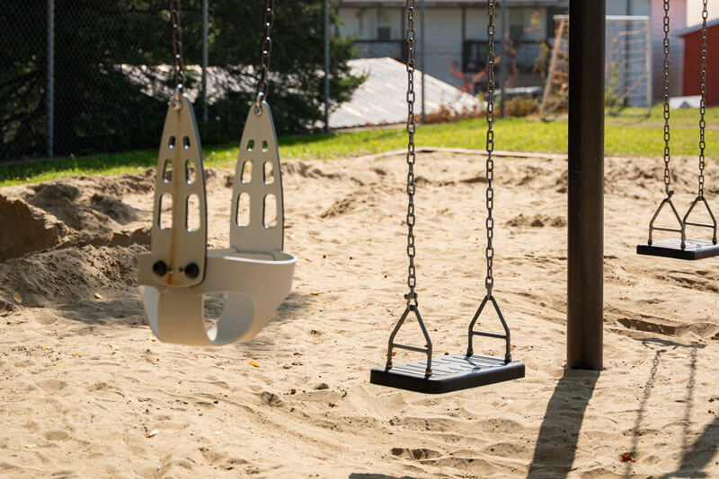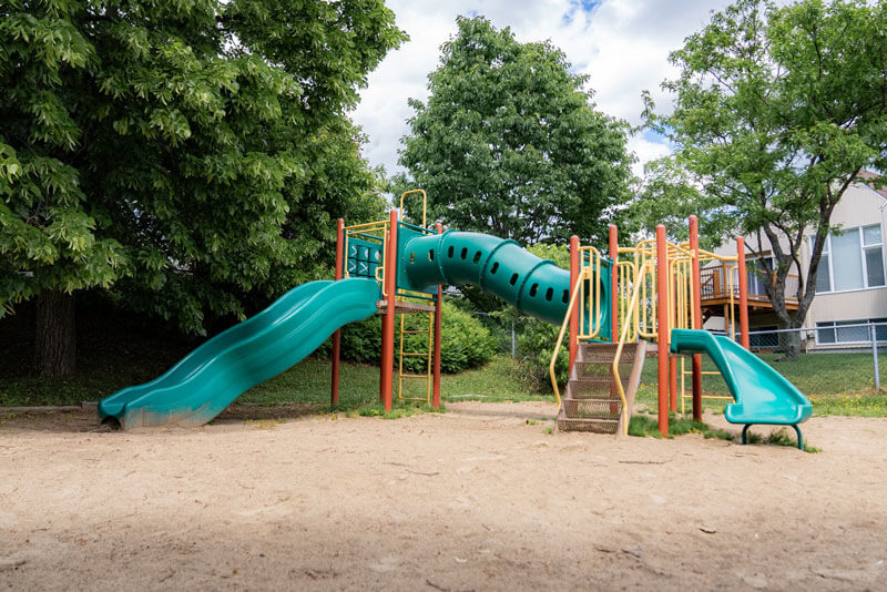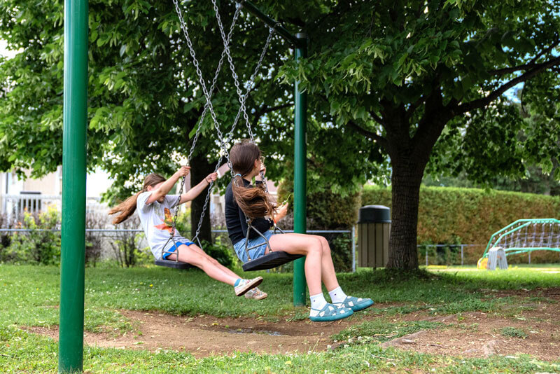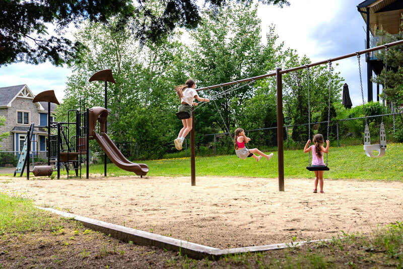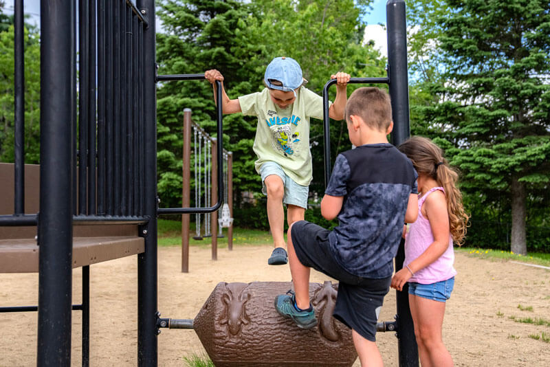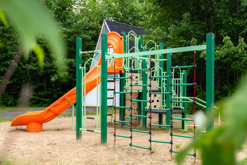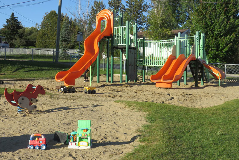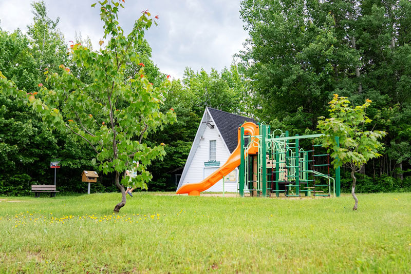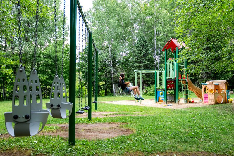Modules de jeux pour les enfants, balançoires, tables à pique-nique, un coffre à bouger (contenant des jouets pour enfants), bancs et buts de soccer.