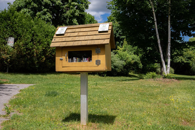 Situé à l'entrée du sentier Mestachibo. Stationnement disponible. Banc, tables à pique-nique et Croque-livres.
