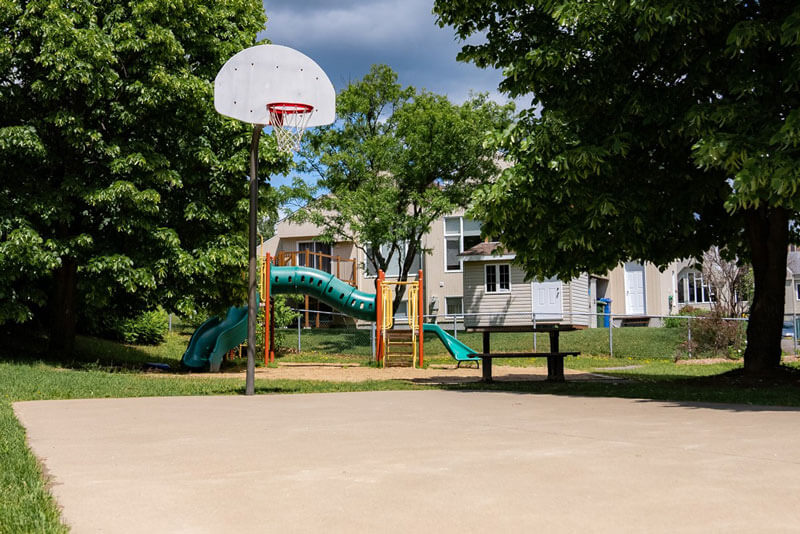 Modules de jeux pour enfants, balançoires, un coffre à bouger (contenant des jouets pour enfants), panier de basquet, tables à pique-nique et Croque-livres