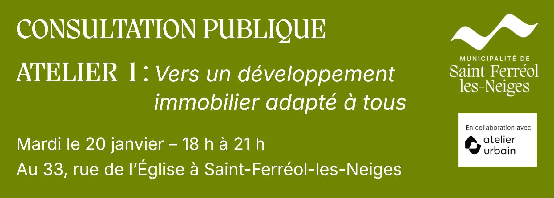 L’atelier portera sur la thématique de l'habitation et du développement du territoire, dans le cadre de la refonte du plan et des règlements d'urbanisme. Cette rencontre sera l’occasion de vous entendre sur l'évolution du marché, la réglementation actuelle, ainsi que le développement durable en habitation. Cliquez ICI pour vous inscrire!