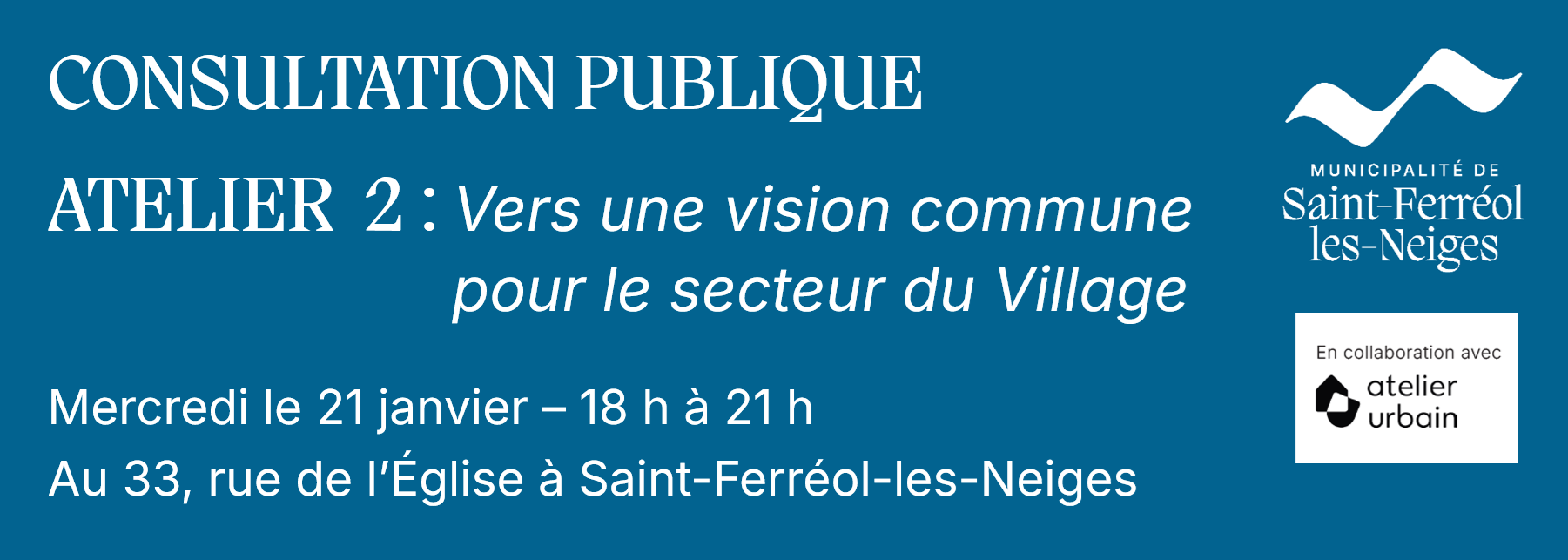 L’atelier portera sur la thématique de la planification du secteur du Village, dans le cadre de la refonte du plan et des règlements d'urbanisme. Cette rencontre sera l’occasion de vous entendre sur les espaces et bâtiments publics, le développement et le patrimoine, ainsi que la communauté et l'offre commerciale. Les inscriptions, c'est par ICI !