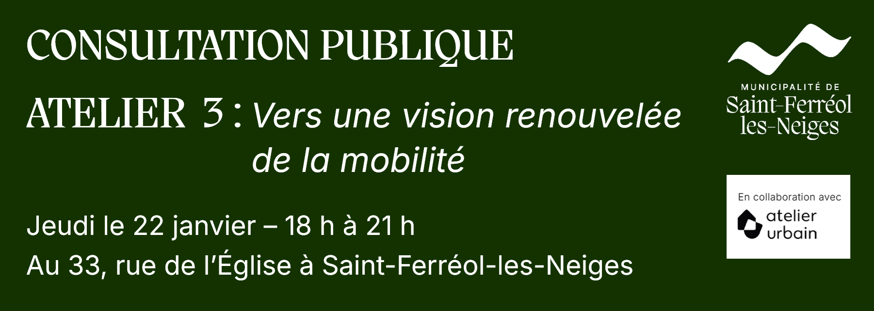 L’atelier portera sur la thématique de la mobilité, dans le cadre de l'élaboration d'un plan de mobilité et de la refonte du plan et des règlements d'urbanisme. Cette rencontre sera l’occasion de vous entendre sur les enjeux, besoins et opportunités en matières de déplacements actifs, collectifs et routiers, le tout dans une perspective autant récréative qu'utilitaire. Cet atelier vous intéresse? Cliquez ICI pour vous inscrire!